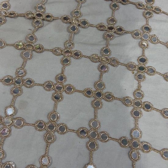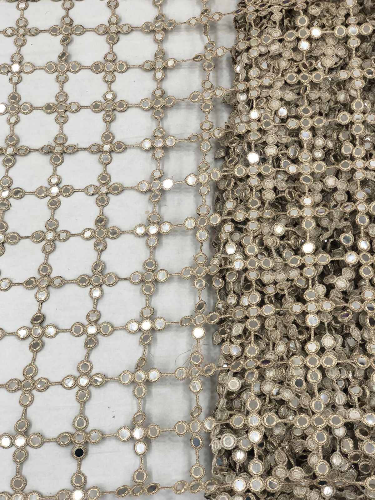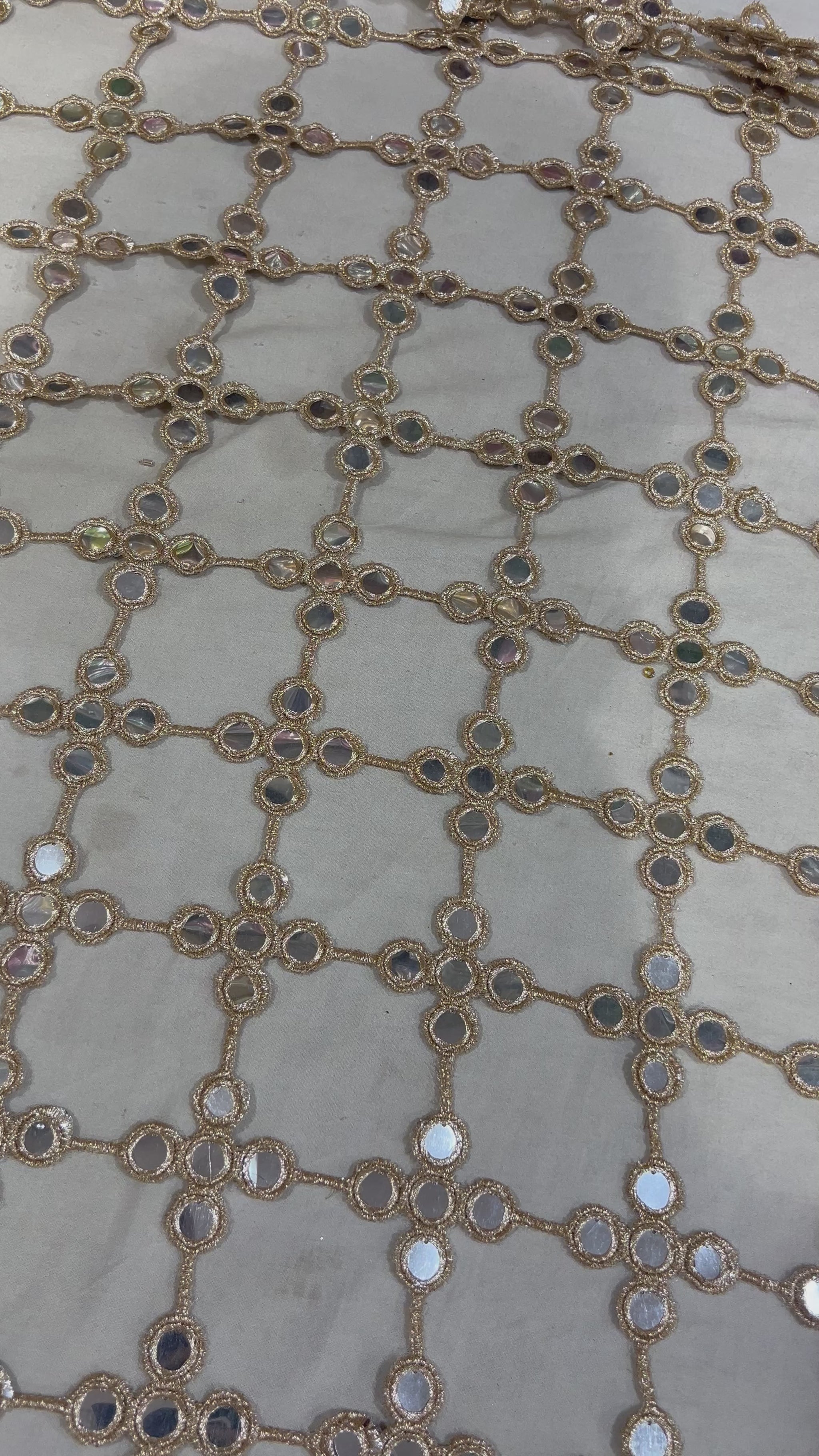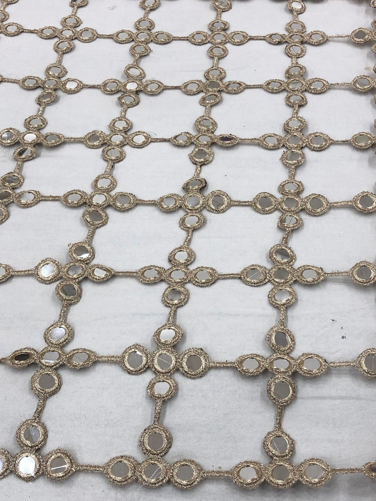 - Work: Small round mirrors are hand-stitched inside circular motifs, forming a lattice-like design.